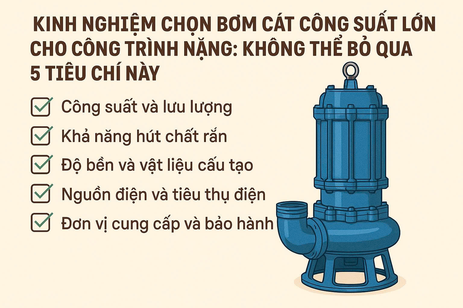 Bơm cát không chỉ hút cát mà còn có thể kèm theo đá nhỏ, rong rêu, bùn đặc. Vì vậy, cần chọn dòng bơm: