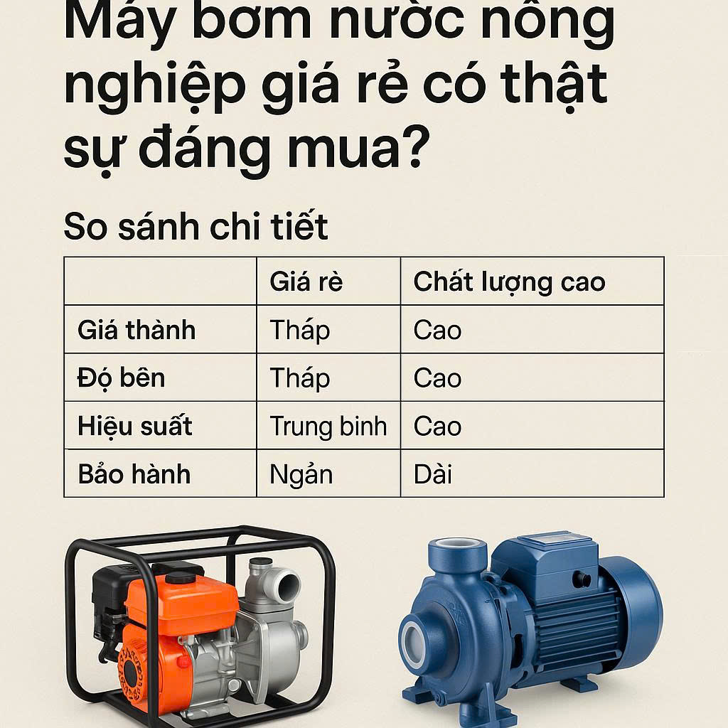 Máy bơm nước nông nghiệp giá rẻ là phương án tạm ổn cho những ai bắt đầu hoặc có nhu cầu giới hạn. Tuy nhiên, để sử dụng lâu dài và ổn định, đầu tư vào thiết bị chính hãng, đáng tin cậy luôn là chọn lựa an toàn hơn.
